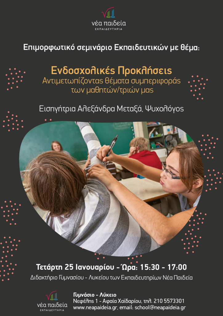 Το Γυμνάσιο των Εκπαιδευτηρίων Νέα Παιδεία , στο πλαίσιο των δράσεων που έχει προγραμματίσει για το σχ.έτος 2022-2023 με άξονα ” Το σχολείο μας ως κοινότητα μάθησης : Επιδιώκοντας την αυτοβελτίωσή μας μέσα από την ενδοσχολική επιμόρφωση”, διοργανώνει την Τετάρτη 25 Ιανουαρίου 2023, το 2ο Επιμορφωτικό Σεμινάριο για εκπαιδευτικούς. Πρόκειται για σεμινάριο ψυχοεκπαιδευτικού χαρακτήρα, με […]