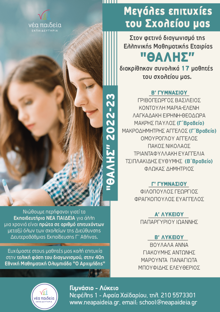 Τρία βραβεία σε μαθητές της Β΄ τάξης του Γυμνασίου μας απένειμε η Ελληνική Μαθηματική Εταιρεία την Κυριακή 19 Μαρτίου 2023 στην τελετή απονομής βραβείων του 83ου Διαγωνισμού «ΘΑΛΗΣ» σχολικού έτους 2022-2023. Οι μαθητές του Σχολείου μας που βραβεύτηκαν είναι οι εξής: 1. Τσιπλακίδης Ευθύμιος, Β΄ Βραβείο 2. Μακροδημήτρης Ευάγγελος – Δημήτριος, Γ΄ Βραβείο 3. Μακρής […]