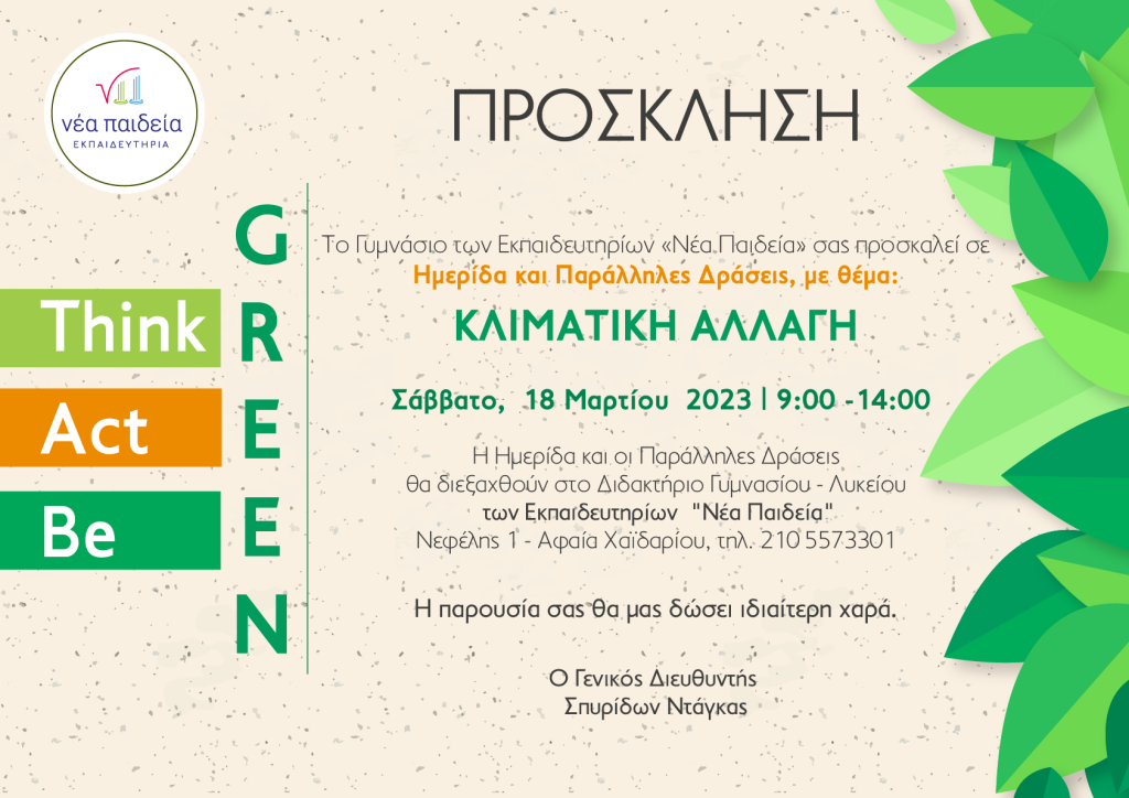Σας περιμένουμε στην Ημερίδα που διοργανώνουν τα Εκπαιδευτήρια Νέα Παιδεία το Σάββατο 18 Μαρτίου 2023, 9.00 – 14.00, με θέμα την Κλιματική Αλλαγή. Η Ημερίδα με τίτλο ” Think Green, Act Green, Be Green” περιλαμβάνει Εισηγήσεις εξειδικευμένων επιστημόνων και Παρουσιάσεις Δράσεων μαθητών-τριών.