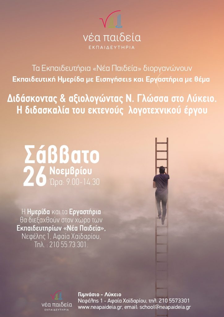 Εκπαιδευτική Ημερίδα και Εργαστήρια με θέμα: «Διδάσκοντας και αξιολογώντας Ν. Γλώσσα στο Λύκειο. Η διδασκαλία του εκτενούς λογοτεχνικού έργου» ΠΡΟΓΡΑΜΜΑ – ΔΗΛΩΣΕΙΣ ΣΥΜΜΕΤΟΧΗΣ Τα Εκπαιδευτήρια «Νέα Παιδεία» και το Περιοδικό Νέα Παιδεία διοργανώνουν Εκπαιδευτική Ημερίδα με Εισηγήσεις και Εργαστήρια αξιολόγησης με θέμα «Διδάσκοντας και αξιολογώντας Ν. Γλώσσα στο Λύκειο. Η διδασκαλία του εκτενούς λογοτεχνικού έργου». […]