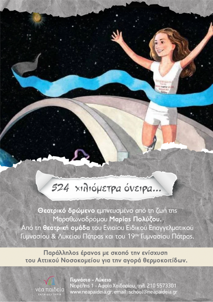 Τα Εκπαιδευτήρια «Νέα Παιδεία», σε συνεργασία µε τις ερασιτεχνικές θεατρικές οµάδες του Ενιαίου Ειδικού Επαγγελµατικού Γυµνασίου &Λυκείου Πάτρας και των µαθητών και αποφοίτων του 19ου Γυµνασίου Πάτρας ανέβασαν, την Παρασκευή, 4 Νοεµβρίου 2022 (ώρα 12.30) στο θέατρο του Γυµνασίου – Λυκείου των Εκπαιδευτηρίων (Νεφέλης 1, Αφαία Χαϊδαρίου) την παράσταση «524 χιλιόµετρα όνειρα». Το έργο αναφέρεται […]