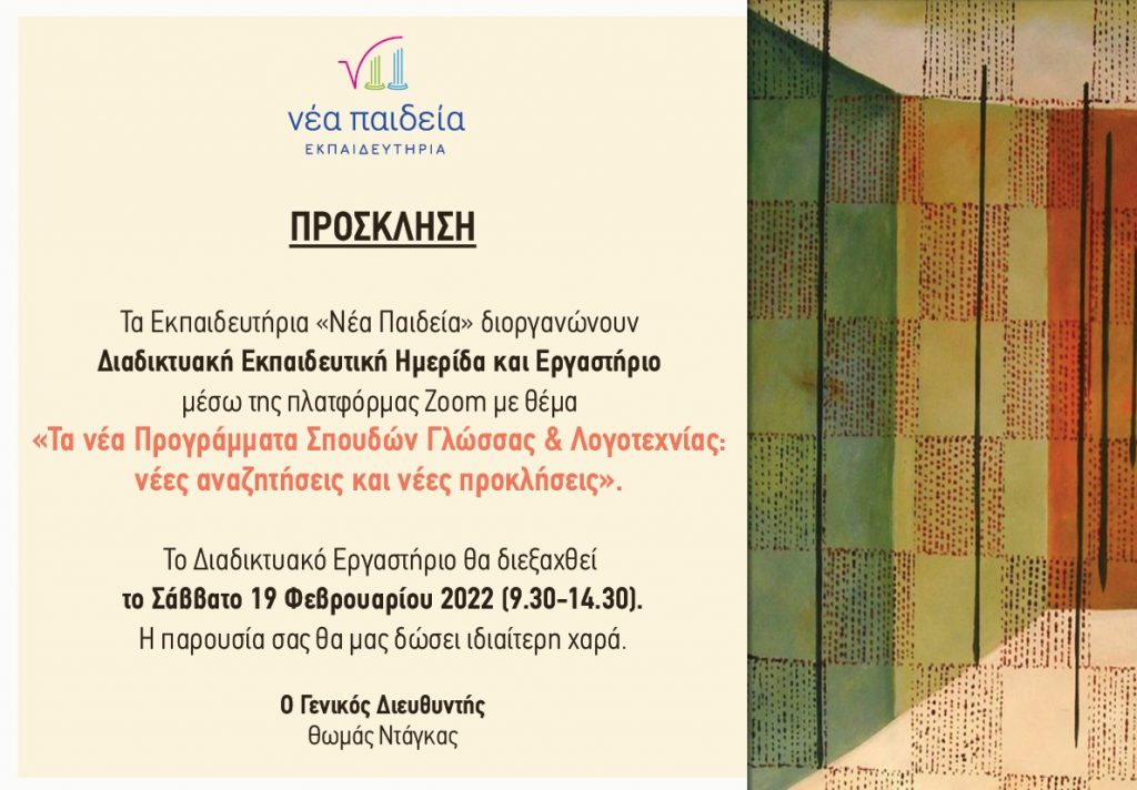 Τα Εκπαιδευτήρια «Νέα Παιδεία» διοργανώνουν Διαδικτυακή Εκπαιδευτική Ημερίδα και Εργαστήριο μέσω της πλατφόρμας Zoom με θέμα «Τα νέα Προγράμματα Σπουδών Γλώσσας & Λογοτεχνίας: νέες αναζητήσεις και νέες προκλήσεις». Το Διαδικτυακό Εργαστήριο θα διεξαχθεί το Σάββατο 19 Φεβρουαρίου 2022 (9.30-14.30) και προσβλέπει σε έναν γόνιμο και δημιουργικό διάλογο σχετικά με τα νέα Προγράμματα Σπουδών Νεοελληνικής Γλώσσας […]