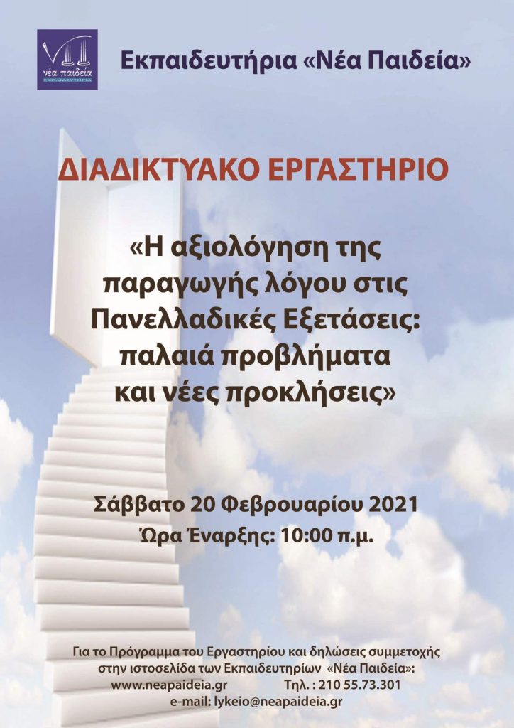 ΔΙΑΔΙΚΤΥΑΚΟ ΕΚΠΑΙΔΕΥΤΙΚΟ ΕΡΓΑΣΤΗΡΙΟ ΑΞΙΟΛΟΓΗΣΗΣ ΤΗΣ ΠΑΡΑΓΩΓΗΣ ΛΟΓΟΥ (ΝΕΟΕΛΛΗΝΙΚΗ ΓΛΩΣΣΑ Γ΄ ΛΥΚΕΙΟΥ) ΘΕΜΑ ΚΑΙ ΠΕΡΙΕΧΟΜΕΝΟ ΗΜΕΡΙΔΑΣ – ΔΗΛΩΣΕΙΣ ΣΥΜΜΕΤΟΧΗΣ Τα Εκπαιδευτήρια «Νέα Παιδεία» διοργανώνουν Διαδικτυακό Εκπαιδευτικό Εργαστήριο μέσω της πλατφόρμας Zoom με θέμα «Η αξιολόγηση της παραγωγής λόγου στις πανελλαδικές εξετάσεις: παλαιά προβλήματα και νέες προκλήσεις». Το Διαδικτυακό Εργαστήριο θα διεξαχθεί το Σάββατο 20 […]