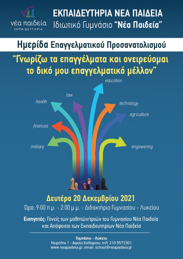 Τα Εκπαιδευτήρια «Νέα Παιδεία» σε συνεργασία με την Εταιρία Συμβούλων Επαγγελματικού Προσανατολισμού Ariston Psychometrics διοργανώνουν διαδικτυακή ημερίδα επαγγελματικού προσανατολισμού την Τετάρτη 24 Φεβρουαρίου στις 10:00πμ για τους μαθητές της Γ΄ Γυμνασίου και Α΄ Λυκείου και τους γονείς τους.