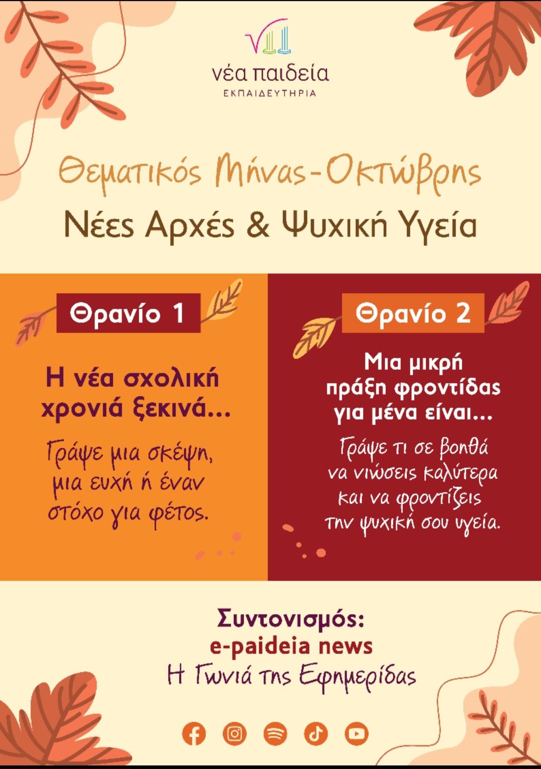 Για τον Οκτώβριο, το θέμα μας είναι «Νέες Αρχές και Ψυχική Υγεία». Οι μαθητές καλούνται να μοιραστούν ευχές, στόχους και σκέψεις που εμπνέουν θετική διάθεση, αυτοφροντίδα και ψυχική ισορροπία, να πάρουν συνεντεύξεις και να πραγματοποιήσουν ρεπορτάζ που θα αναδεικνύουν τη σημασία του θέματος μέσα από τη δική τους οπτική.