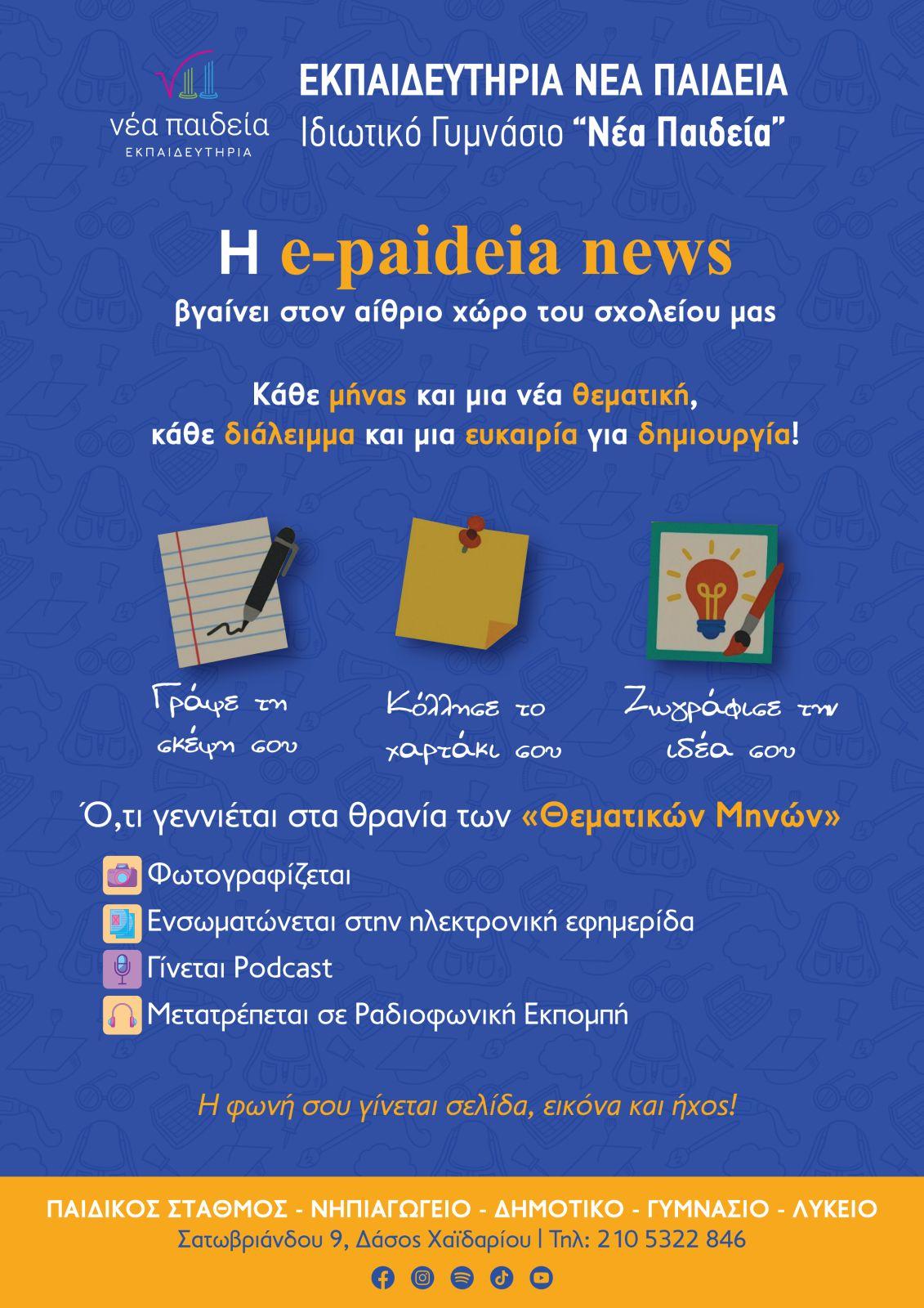 Η βραβευμένη επί δύο συναπτά έτη σχολική μας εφημερίδα e-paideia news δίνει νέα πνοή στη σχολική ζωή, μεταφέροντας τη δημιουργικότητα και τη φωνή των μαθητών στον αίθριο χώρο του σχολείου μας.