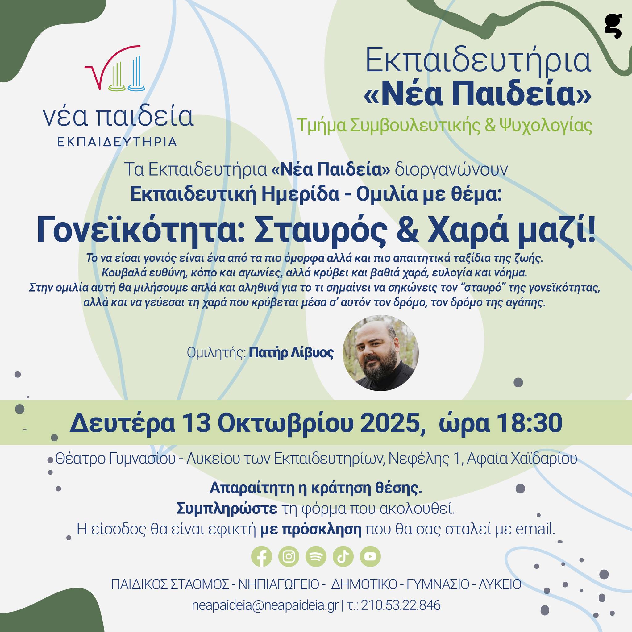 Το Τμήμα Συμβουλευτικής και Ψυχολογίας των Εκπαιδευτηρίων Νέα Παιδεία, στο πλαίσιο της Σχολής Γονέων, διοργανώνει την πρώτη, για τη σχολική χρονιά 2025-2026, σημαντική δια ζώσης συνάντηση με τον πρεσβύτερο και συγγραφέα, Πατέρα Λίβυο.