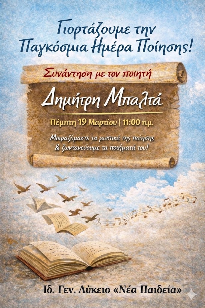 Με αφορμή τον εορτασμό της Παγκόσμιας Ημέρας Ποίησης, τα Εκπαιδευτήρια «Νέα Παιδεία» γιορτάζουν την τέχνη που, αιώνες τώρα, δίνει ρυθμό στις πιο μύχιες σκέψεις μας, την Ποίηση. Την Πέμπτη 19 Μαρτίου, στις 11:00 π.μ., υποδεχόμαστε στον χώρο μας τον νέο ποιητή και φιλόλογο Δημήτρη Μπαλτά, σε μια συνάντηση όπου ο ποιητής θα μοιραστεί μαζί μας τα μυστικά της τέχνης του και οι μαθητές και μαθήτριές μας θα δώσουν τη δική τους πνοή σε επιλεγμένα ποιήματά του.