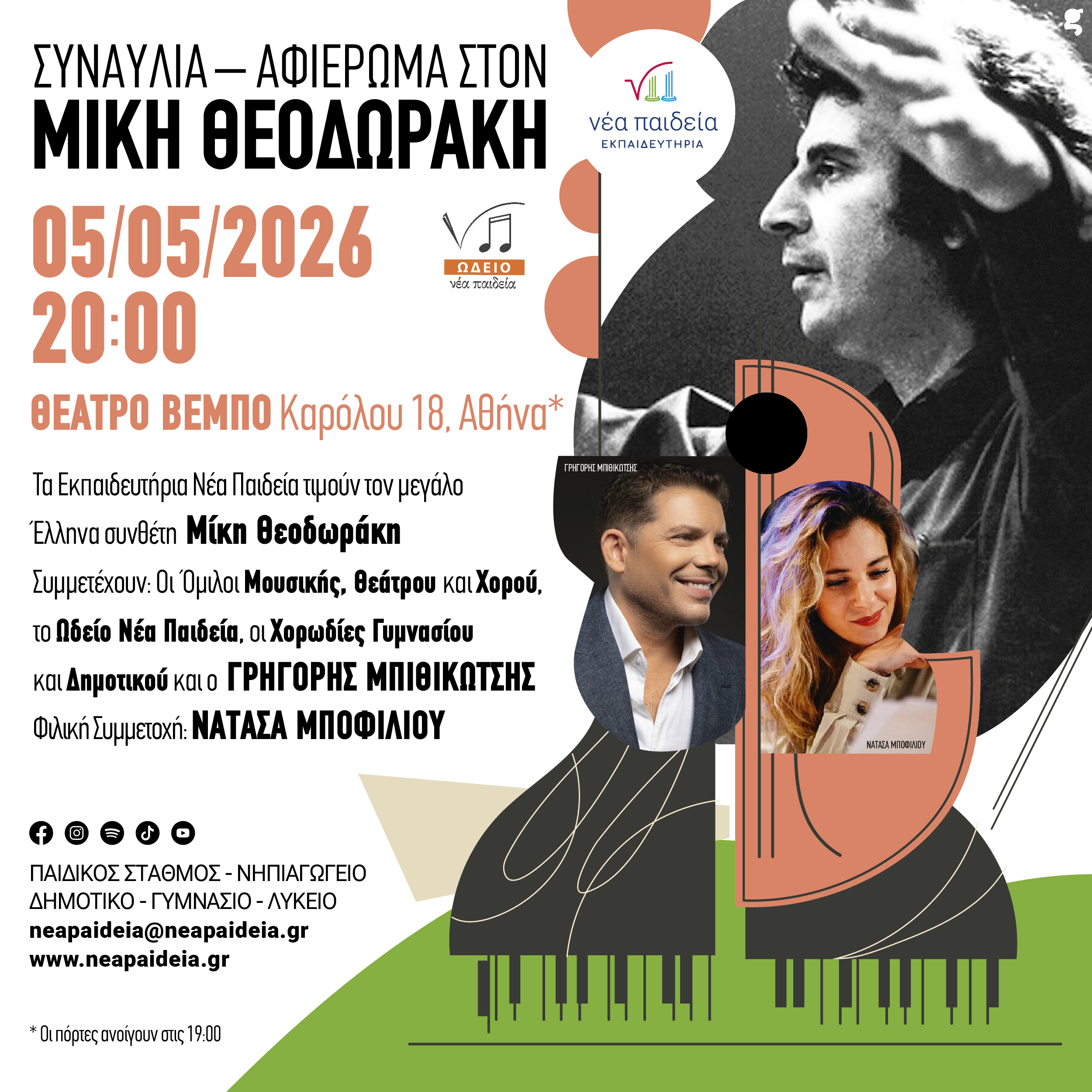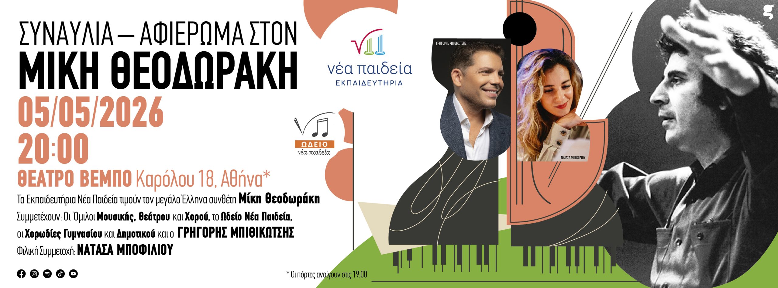 Τα Εκπαιδευτήρια Νέα Παιδεία παρουσιάζουν ένα ξεχωριστό αφιέρωμα στον Μίκη Θεοδωράκη, δημιουργό που σφράγισε τον πολιτισμό και την ιστορική πορεία του τόπου μας με έργα βαθιά συγκινητικά και διαχρονικά.